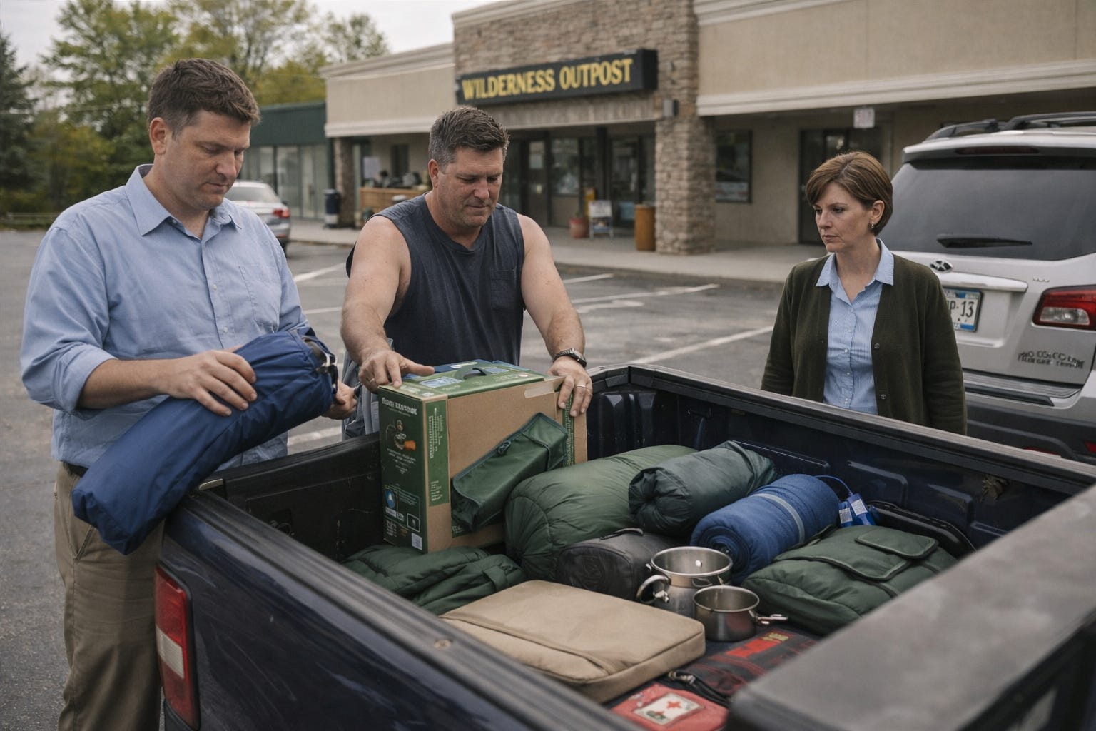 Corey stood at the register with a cart that contained the tent, the green sleeping bag, the questionable camp chair, the overweight mess kit, a headlamp, a ground pad that Danny had selected without consultation, a first aid kit, two packages of fire starters, and a rain jacket that was the one item on which both men agreed: it was functional, well-made, and happened to be a shade of blue that Corey found acceptable. The total was four hundred and sixty-two dollars. Corey paid it like someone signing a check and trusting the amount would make sense later.